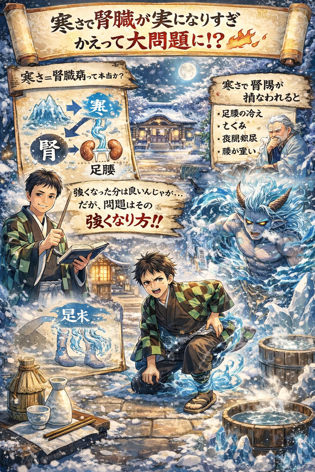 つまり「寒いと腎臓病になる」というより、寒さによって腎が“固まりすぎ”、陽気が損なわれた結果、腎の水分代謝が破綻する――これが中国医学的な本質です。